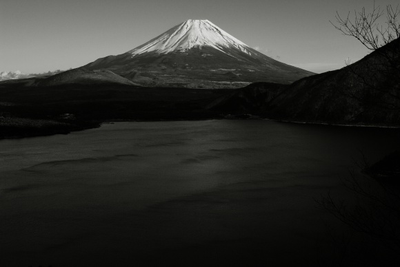 本栖湖と富士。湖面がゆれている。