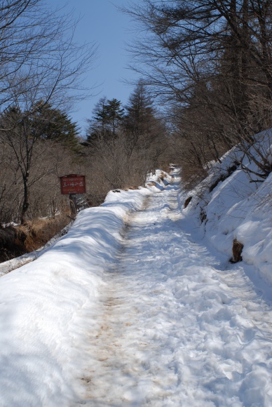 ところが、4月になったというのに御坂側の登山道は残雪でアイスバーン状態。つるつるすべりながら二人で大騒ぎで登る。