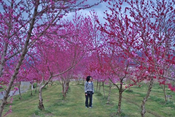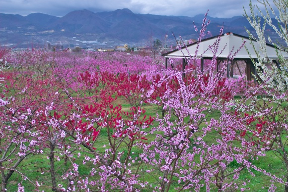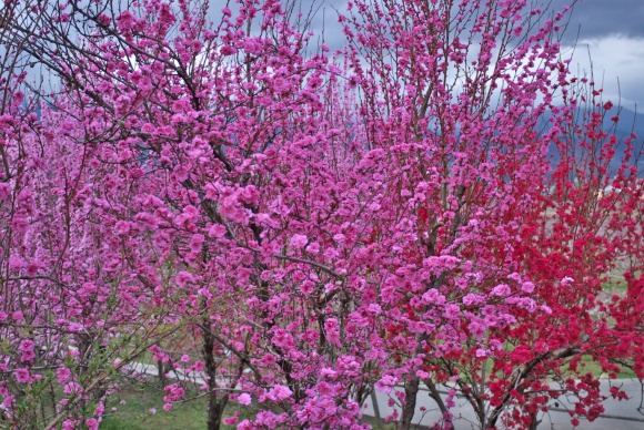 花桃園に近づくと、薄闇の中ピンクにぼーっと燃えているようだ。