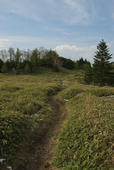 甘利山から千頭星山へ。広い笹原の中を登山道がうねる。千頭星への道はところどころ雪が残ってる。