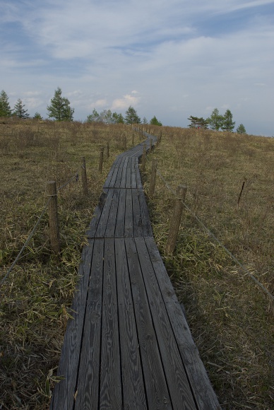 ここには一面ツツジが咲き誇るが、少し早かった。木道が天に昇るように続く。