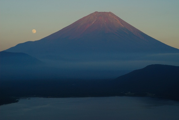 赤富士と月。