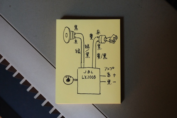 コードの色とスピーカー端子の色を間違えないようにメモした。とりあえず正当な接続で様子を見る(聴く?)