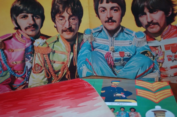 見開きのジャケット。インナースリーブもサイケなピンクカムフラージュ柄。このレコードで一番おしゃれな部分だな。こんな時代感覚がどれだけ当時ビートルズがとんがっていたか分かる。当時のレコードはそれまでみんなレコード会社の共通スリーブだった。ここまでオリジナルにしたのはビートルズが初めて。しかもペッパー軍曹の変身セットのオマケ付き。